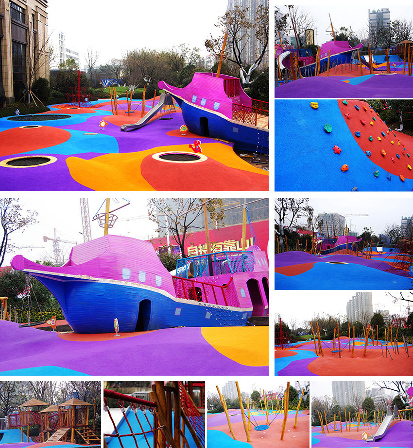 游樂設備分為沉船、樹屋、滑梯、爬網、網兜和兩種木質的秋千,沉船、樹屋和大型爬網是作為場地的主要大型游樂設備,沉船長13 米,高4 米,寬4 米,內部小型的游樂設施包含小型爬網、大型的不銹鋼滑梯以及秋千和攀爬件等,船體用藍色和粉色兩種色系裝飾。