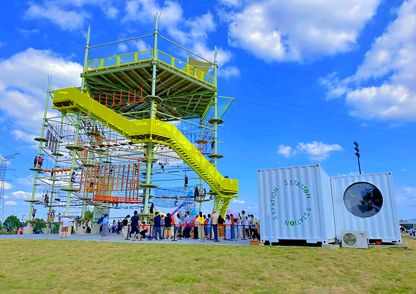 寧波“5號空間站-綜合探險水晶塔”,整塔高18m,共五層,設計有兒童步道、成人步道、攀巖、螺旋滑梯、低空蹦極和高空滑索等項目。