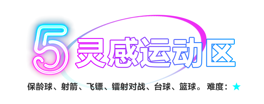 保齡球、情景射箭、鐳射對戰、真人CS、曲棍球、臺球、籃球、飛鏢等項目將體育項目與環境特效良好結合,帶來煥然一新的視覺體驗。