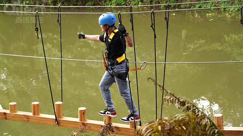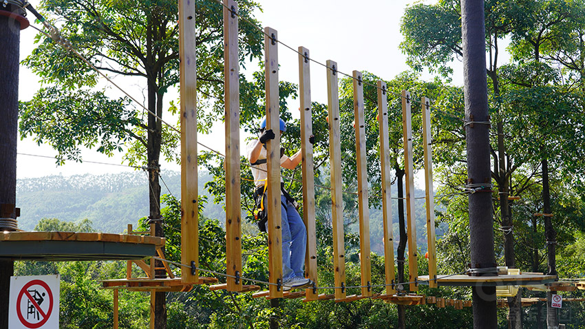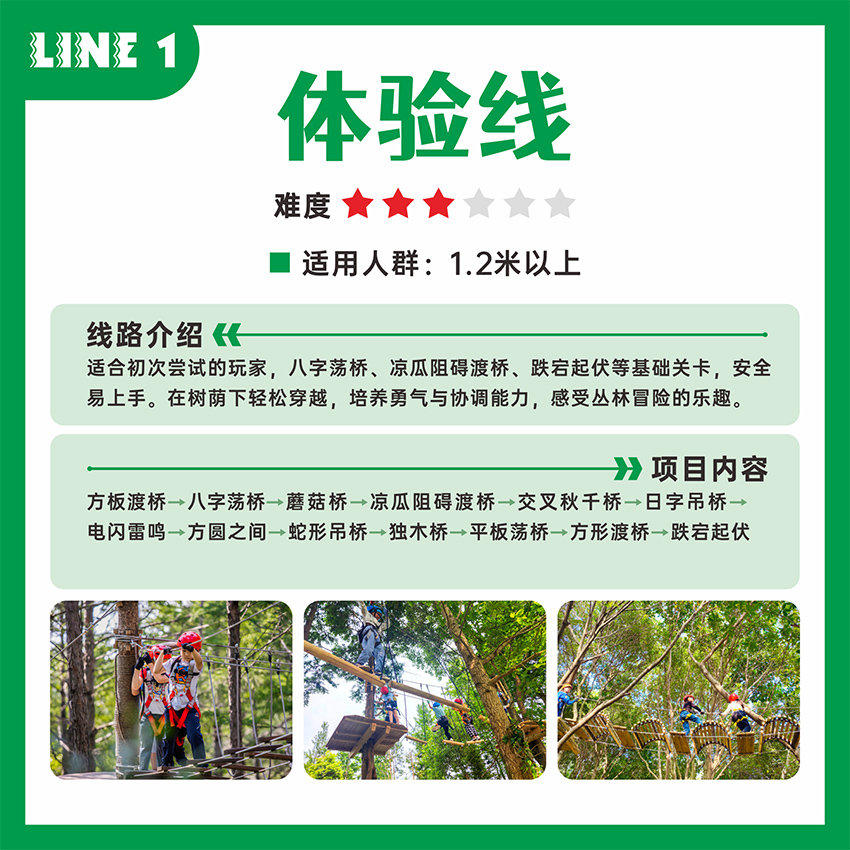 作為入門級線路,體驗線高度適中,環節設置溫和有趣。包含短距離的獨木橋、蘑菇橋和交叉秋千橋等。它旨在幫助游客,尤其是孩子們,消除恐高心理,建立自信,初步掌握平衡與協調能力。