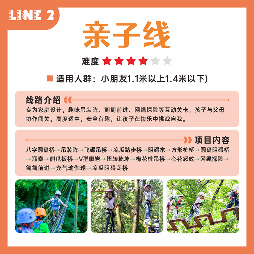 這是一條專為親子互動設計的溫情線路,可以增強了親子間的信任與默契。部分關卡需要家長與孩子共同協作才能完成,如雙人同步行走的木板橋、需要互相拉拽才能通過的繩網等。