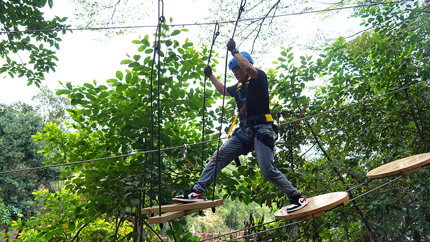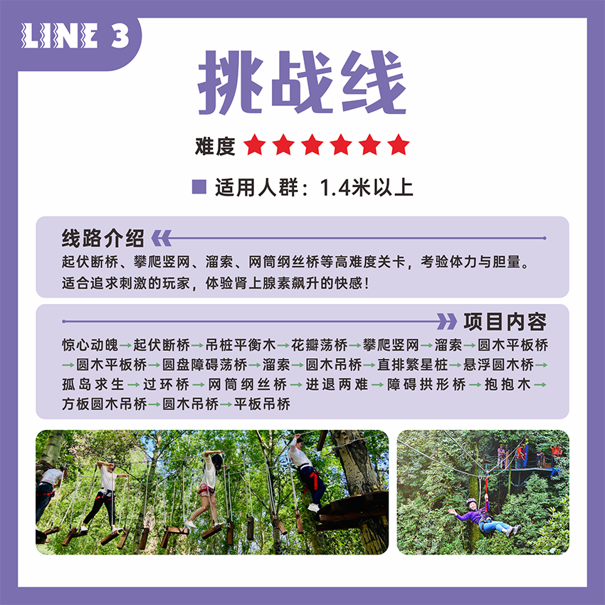 專為勇敢者準備的進階之路!挑戰線擁有更高的平臺、更長的滑索和更復雜的障礙組合,如連續高空吊樁、Z字形平衡木、溜索、進退兩難等。每一步都在考驗你的體力、耐力和心理素質。