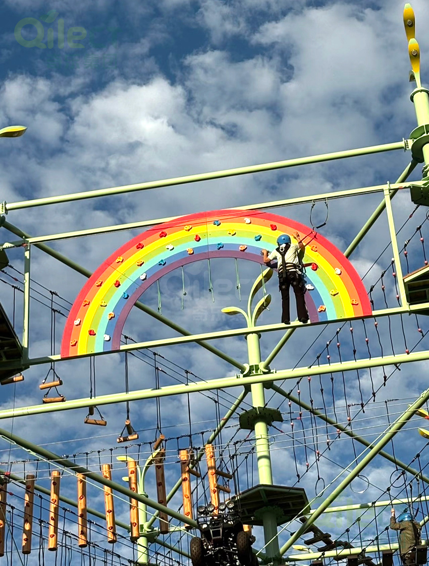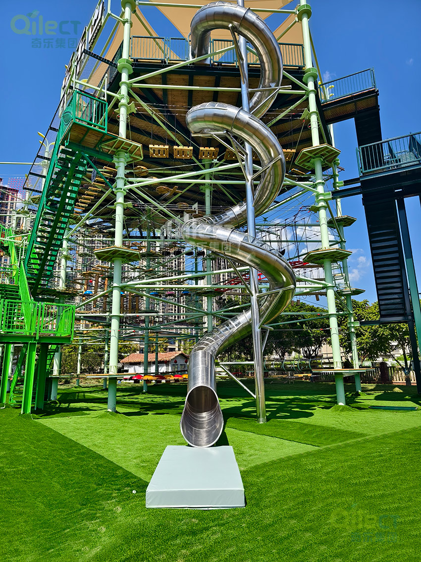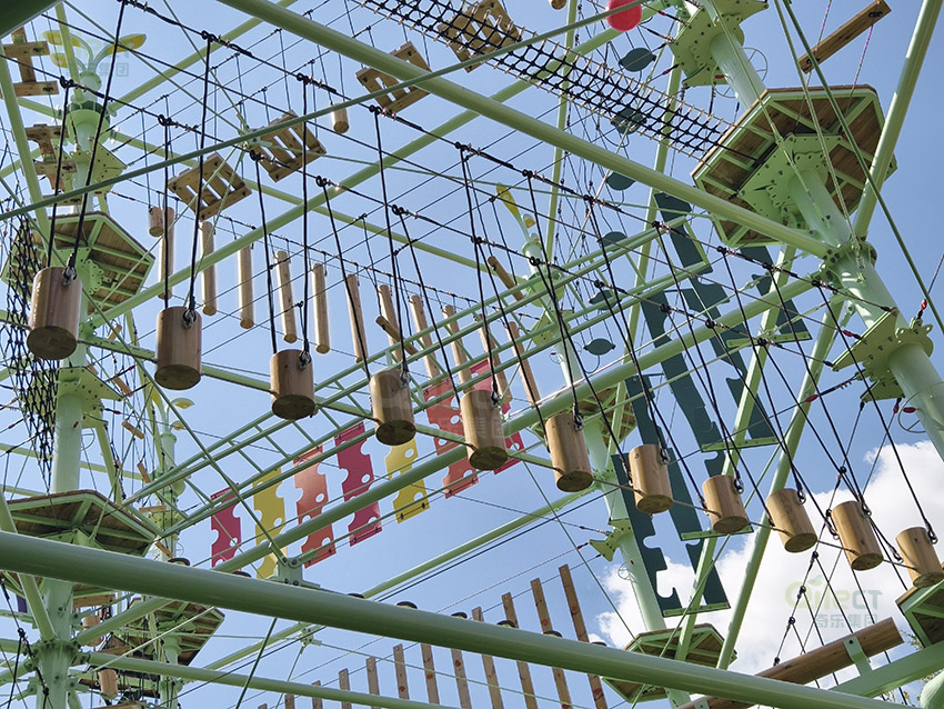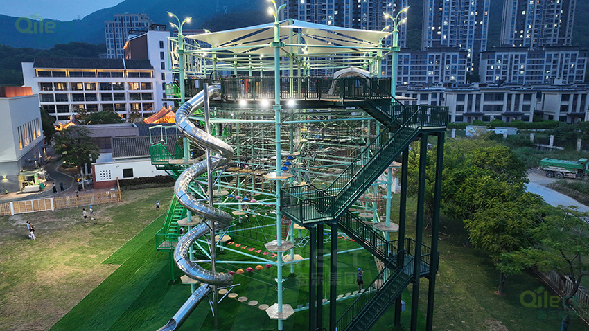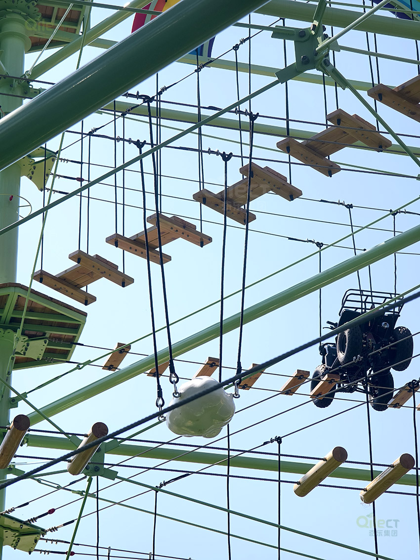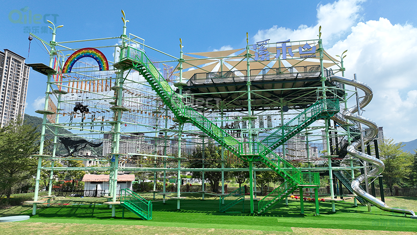 溪禾山探險水晶塔設備總面積達620㎡,總高20m,4層設計,設計了近百個游玩項目,如旋轉尖叫滑梯、高空速降、彩虹橋等。