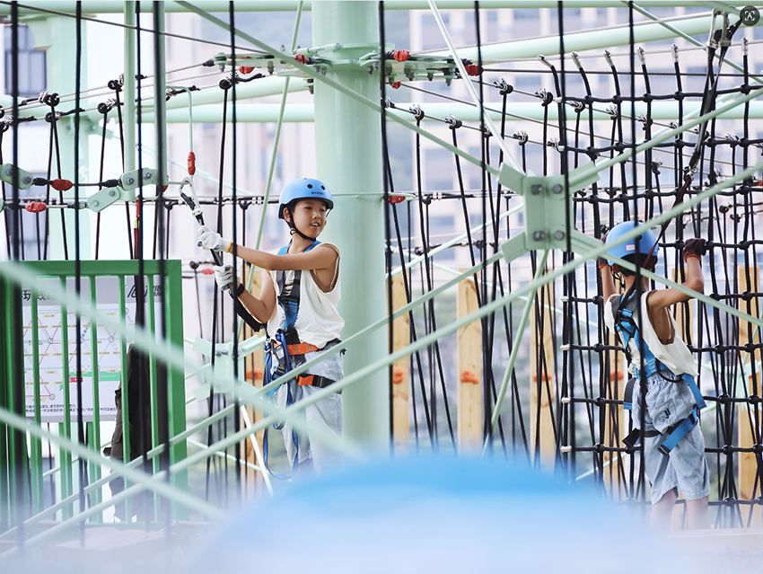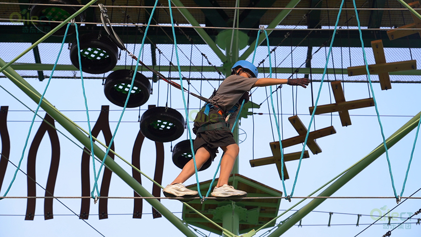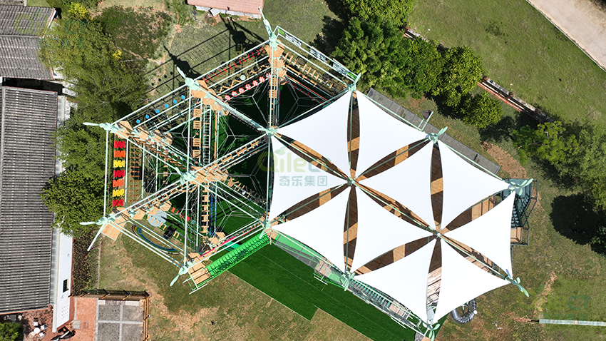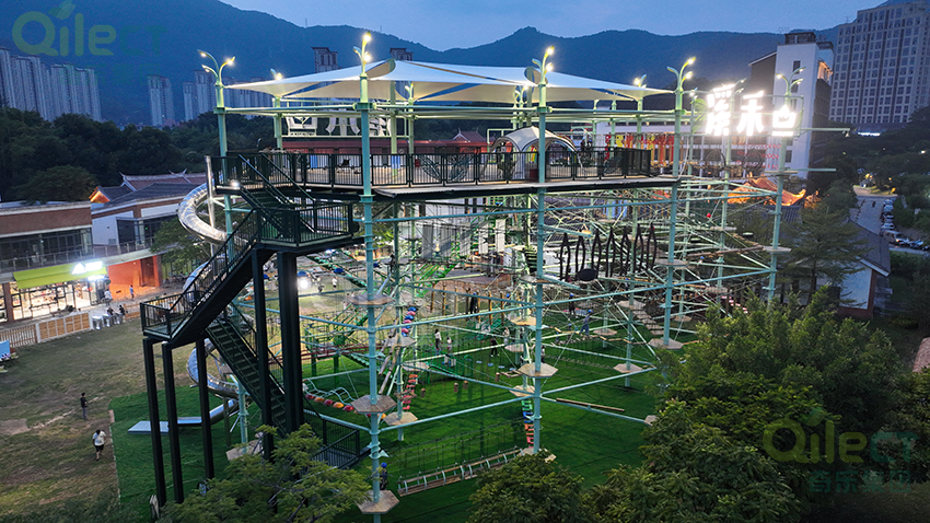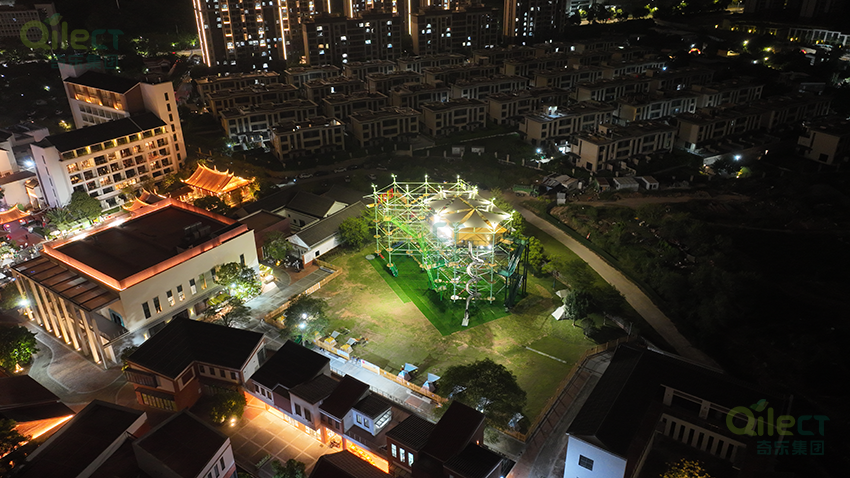 溪禾山水晶塔是奇樂集團已“茶文化”為主題,融入了茶道元素,并結合了七匹狼的品牌形象和調性而設計建造的高空拓展矩陣項目,是國內首個“茶文化”高空冒險IP,也是福建單體最大戶外繩索探險塔。